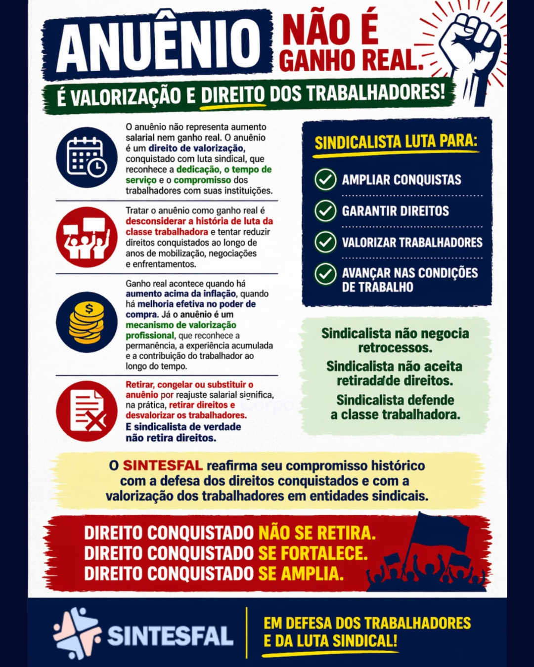 O Sintesfal destaca a importância do anuênio como um direito histórico da categoria e não como aumento salarial ou ganho real. A entidade explica que o anuênio é um mecanismo [...]
