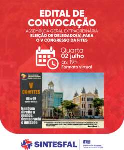 A Diretoria do SINTESFAL, no uso de suas atribuições estatutárias, convoca todos/as os/as filiados/as para participarem da Assembleia Geral Extraordinária, a ser realizada de forma virtual, conforme as seguintes informações: