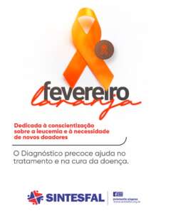 A campanha Fevereiro Laranja tem como objetivo conscientizar a população sobre a leucemia, alertar para a importância do diagnóstico precoce e incentivar a doação de medula óssea. O Sintesfal reforça, ainda, a relevância de hábitos de vida saudáveis como forma de prevenção de doenças e de promoção da saúde.