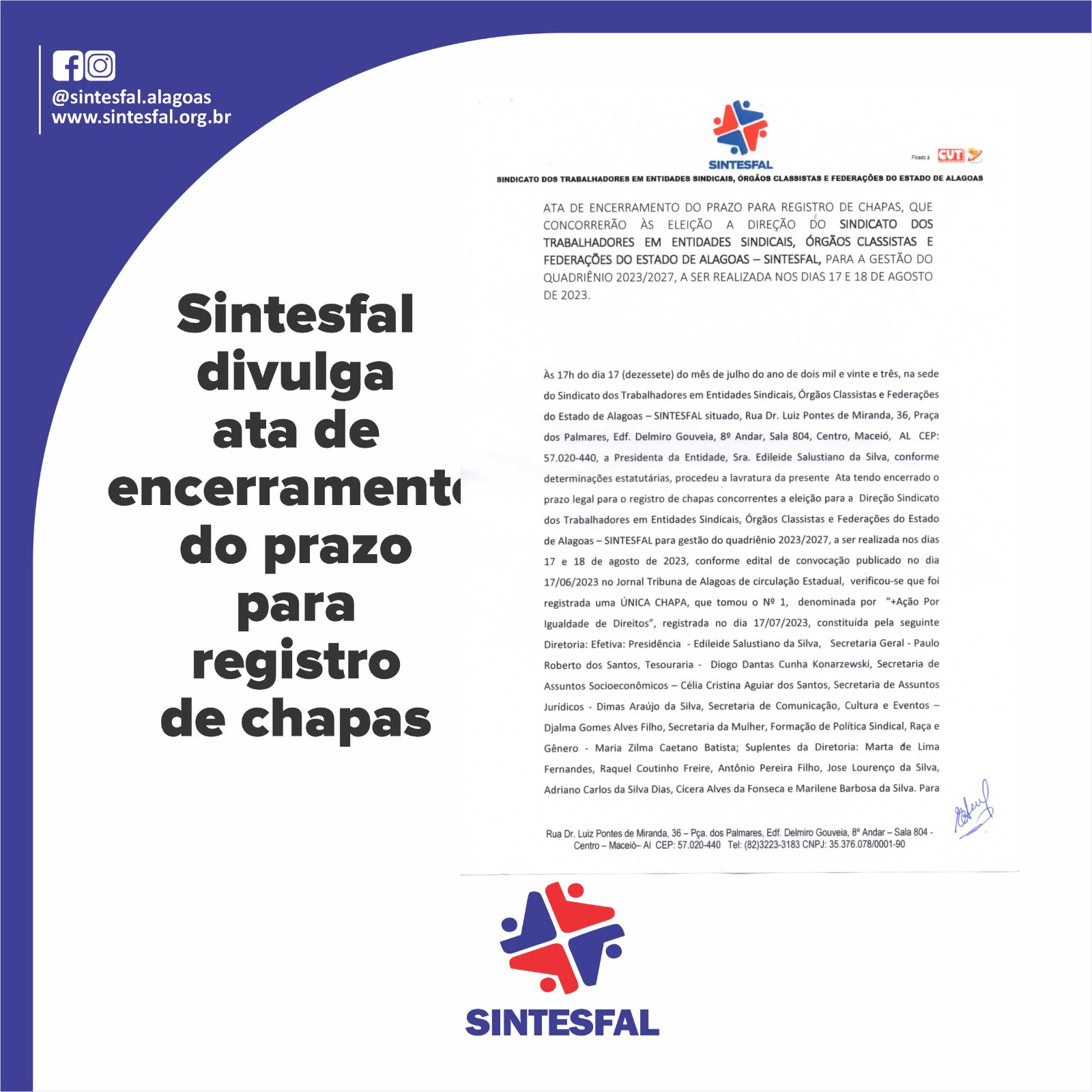 O Sintesfal divulga Ata de Encerramento do prazo para registro de chapas das eleições a serem realizada nos dias 17 e 18 de agosto de 2023, conforme determinações estatutárias, para [...]