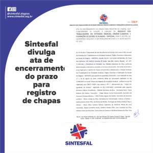 O Sintesfal divulga Ata de Encerramento do prazo para registro de chapas das eleições a serem realizada nos dias 17 e 18 de agosto de 2023, conforme determinações estatutárias, para gestão do quadriênio 2023/2027.