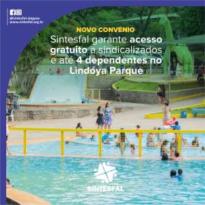 Como parte do programa da nova gestão do Sintesfal, a diretoria está reativando convênios e celebrando novas parcerias. O mais recente benefício conquistado pelo Sintesfal é o convênio com o Parque Aquático do Lindoya, que oferece entrada gratuita para até cinco pessoas por família, incluindo o sindicalizado e até quatro dependentes.